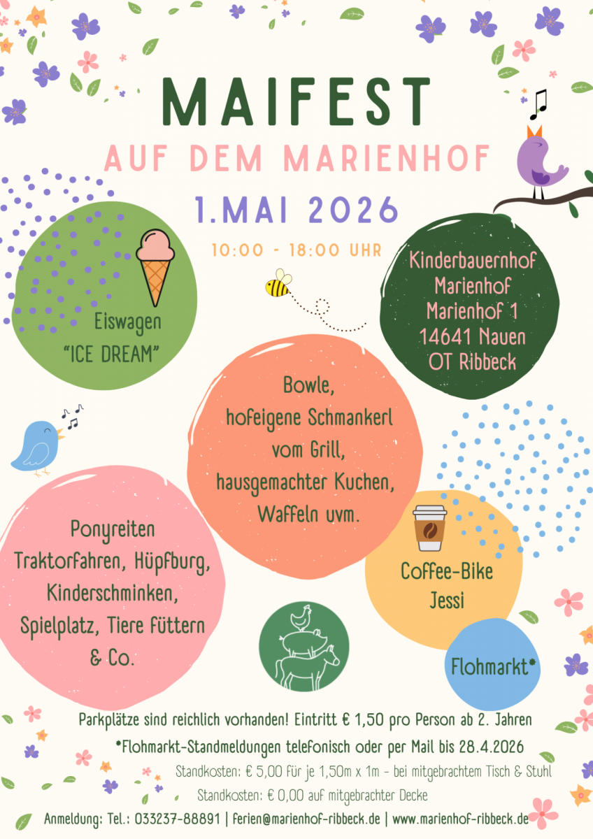 freut euch auch in diesem Jahr wieder auf unser Maifest am 1. Mai 2025 von 10:00 bis 18:00 Uhr. Für Groß und Klein ist jede Menge dabei. Traktorfahren, Ponyreiten, Hüpfeburg, Flohmarkt uvw. sowie leckere Schmankerl vom Grill, Bowle und kalte Getränke, hausgemachten Kuchen, Waffeln und, und, und.